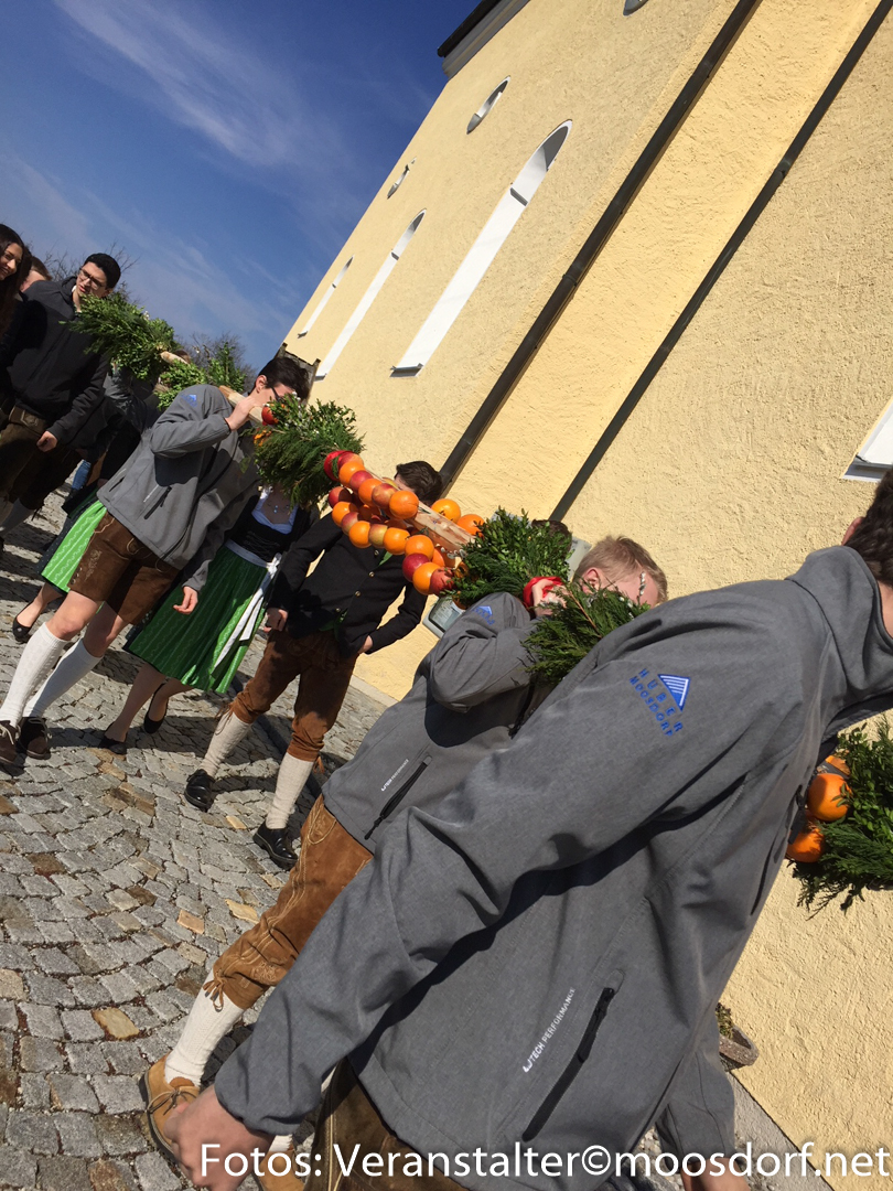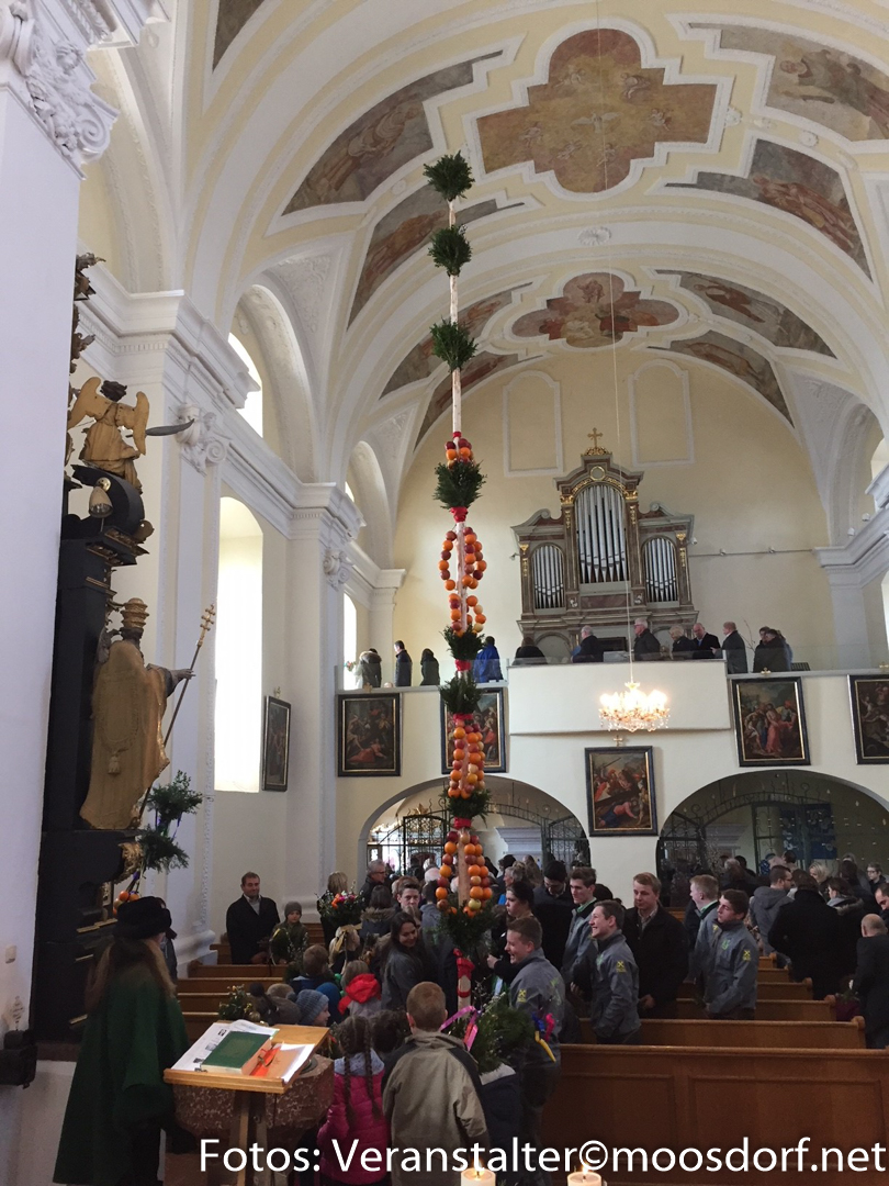 7,5 Meter hoch und mit 115 Stück Obst war unser Baum bestückt! Mit 23 Mitgliedern rückten wir zum gemeinsamen Gottesdienst aus und versammelten uns am Kirchenplatz wo der Palmbaum, die Palmbuschen und Palmzweige von Herrn Oberndorfer geweiht wurden. Nach dem Gottesdienst verteilten wir das geweihte Obst vom Palmbaum an die Anwesenden.