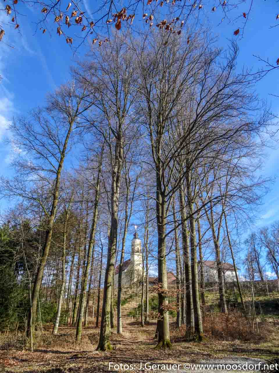 Für manche mag die Kirche hinter dem Wald sein, für andere strahlt das Kreuz am Turm weit ins Land und Leben begleitend hell in ihren Alltag. Sicher eint die Betenden drinnen und die Feiertags-Gestimmten draußen der österliche Wunsch „Friede sei mit Euch!“