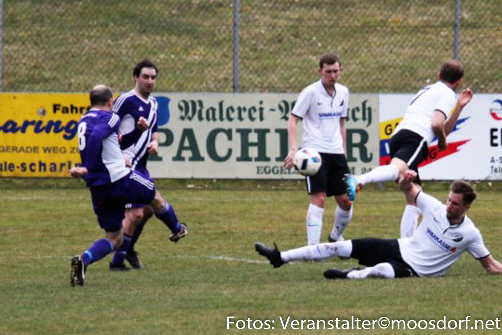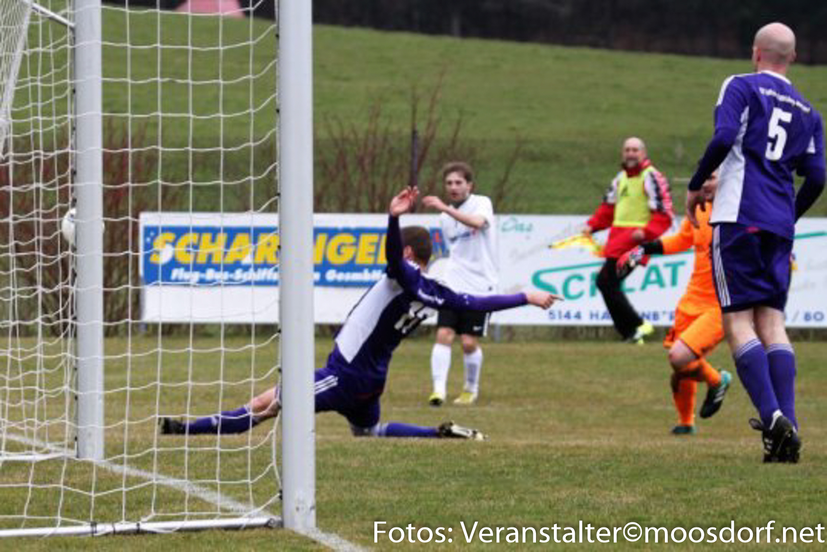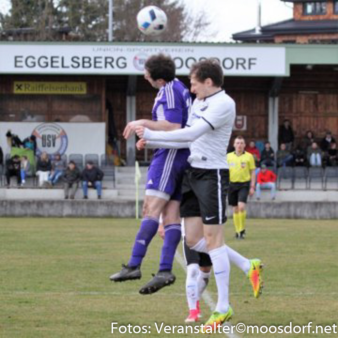 Augenblicke später beinahe das 2:0, jedoch scheitert der prächtig aufgelegte Stefan Schwaiger am Aluminium. Bärenstark präsentierte sich vor allem die Abwehrreihe des USV Eggelsberg Moosdorf, die den spielstarken Istvan Vituska und Stefan Kornfelder kaum zur Geltung kommen lassen. Nur bei einem Schuss aus spitzen Winkel herrschte Gefahr im Strafraum des USV. Dieser wurde aber von Thomas Stöllberger mit einer tollen Grätsche geblockt. Kurz vor der Halbzeitpause herrschte große Aufregung unter den Zuschauern, als der Pfiff des Unparteiischen, nach einem klaren Foul an Gergö Nagy stumm blieb und somit auf Abstoß anstatt auf Strafstoß für den USV entschied. Somit ging man mit einer knappen 1:0 Führung in die Kabine.