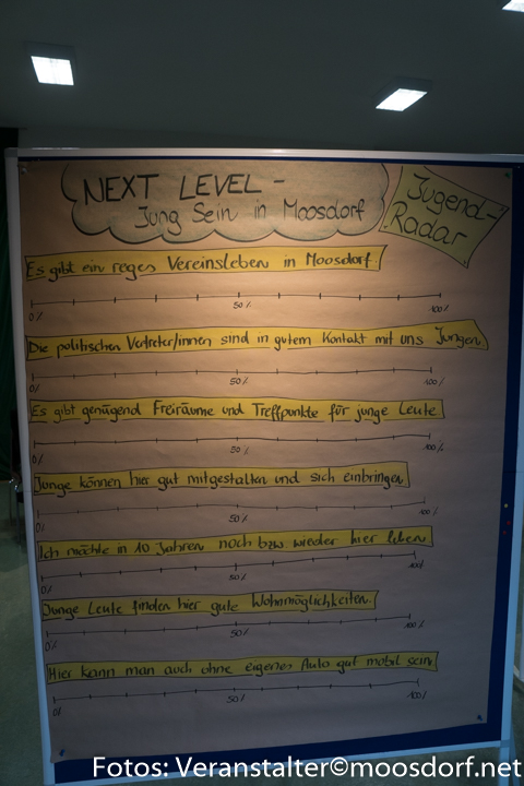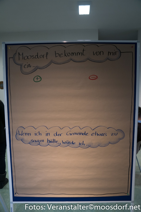 Auf einem Flipchart waren verschiedene Bereiche aus Moosdorf, wie zum Beispiel die Wohnsituation oder das Vereinswesen aufgezeichnet.