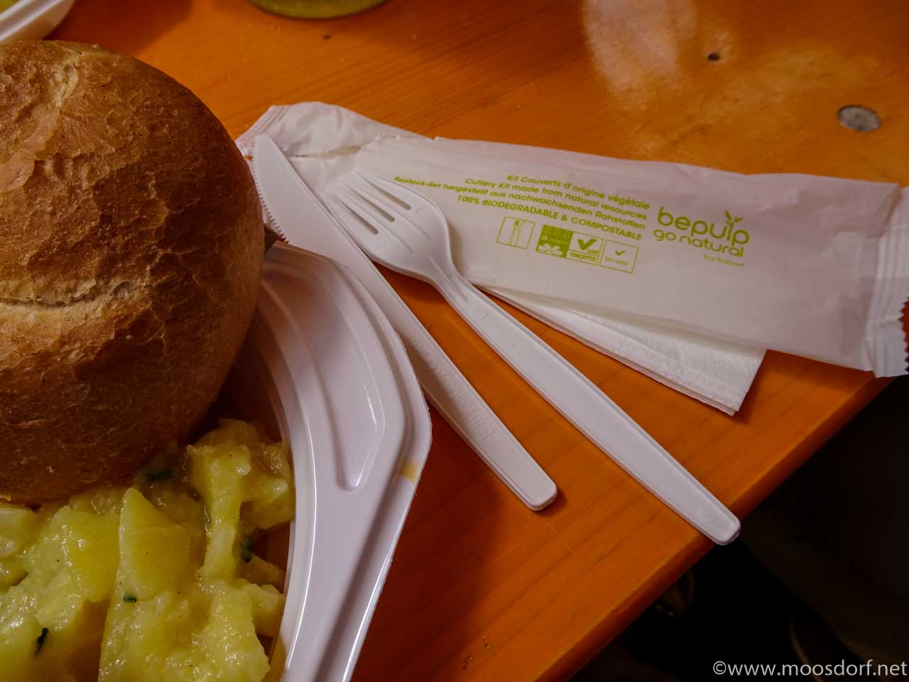 Und was wir ebenfalls besonders gut fanden: das Besteck und auch seine Umverpackung waren – so konnte man lesen – zu 100% kompostierbar. Das ist eine gute Idee sicher für viele ähnliche Events in Moosdorf.
