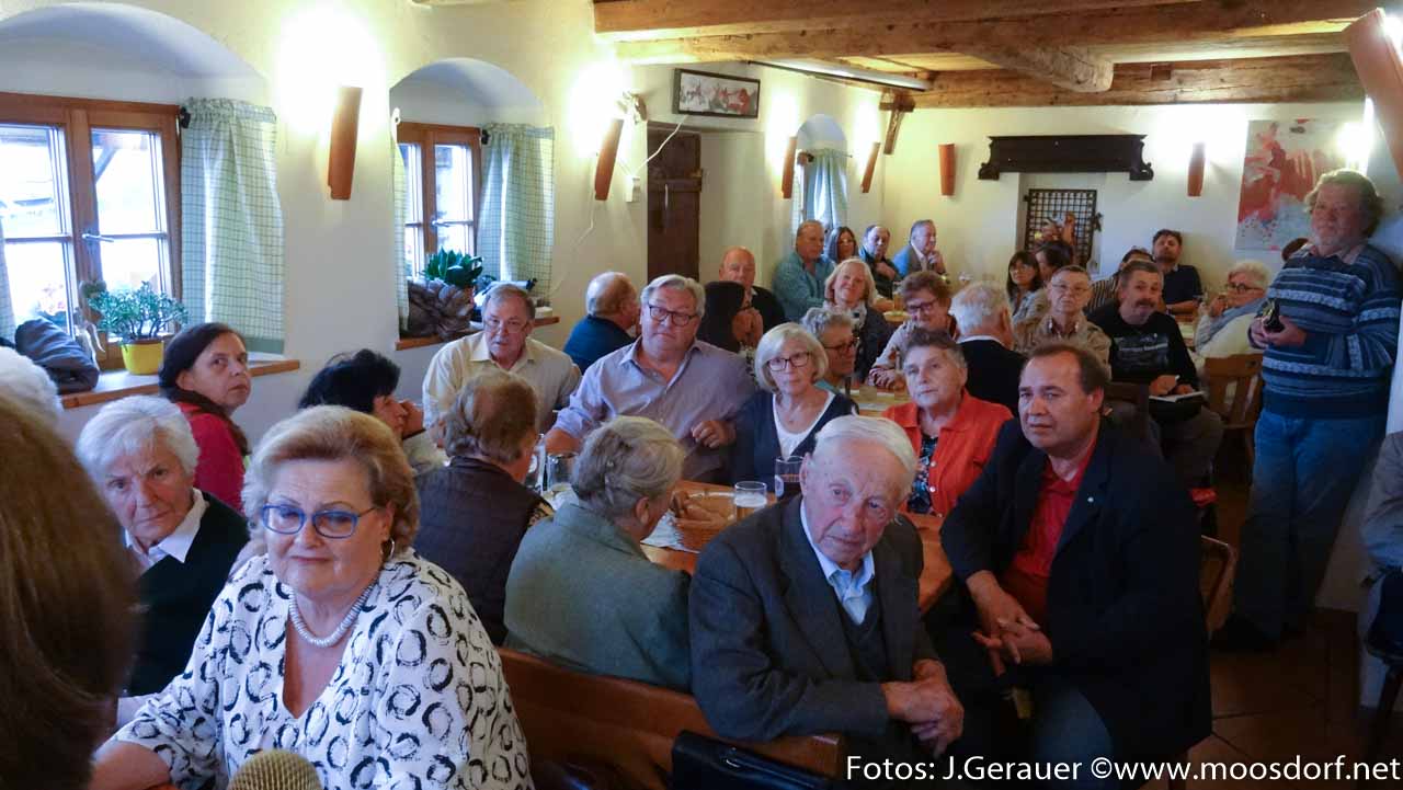Hochinteressant war’s nicht nur für manch anwesende Nachkommen und Nachbarn von im Buch handelnden Personen. Stellvertretend für mehrere anwesende Zeitzeugen wurde Anna Brandstätter begrüßt. Gäste aus umliegenden Gemeinden füllten zusammen mit vielen MoosdorferInnen, unter anderem auch Kurat Ferdinand Oberndorfer, die Jausenstation Peer bis auf den letzten Platz. Die Disziplin der Anwesenden, ihr ruhiges Zuhören, muss dabei ausdrücklich lobend erwähnt werden!