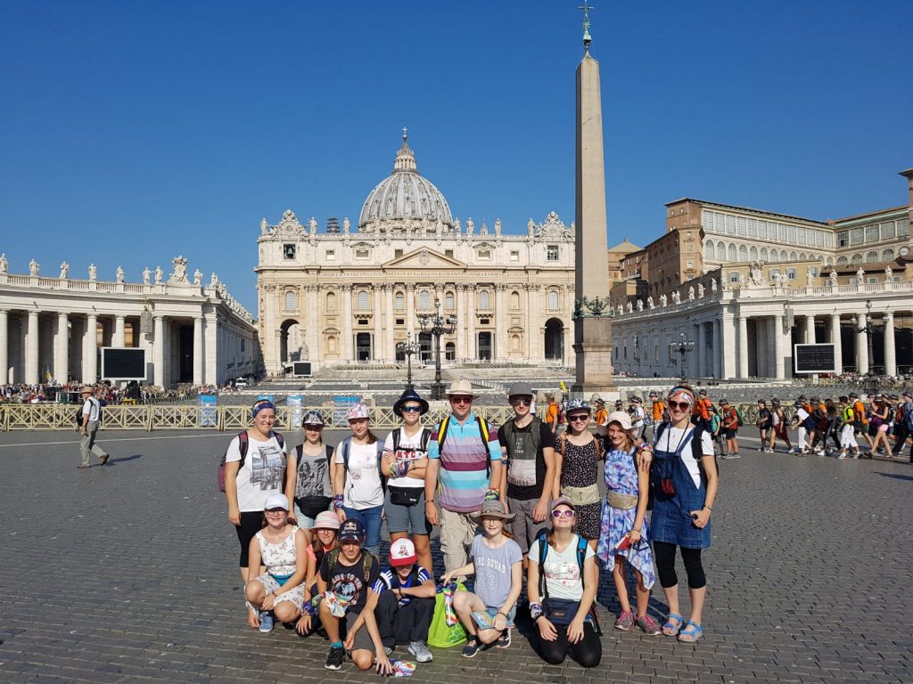 „Grüße von der internationalen Ministranten Wallfahrt aus Rom. Die Ministranten aus Eggelsberg, Geretsberg und Moosdorf. Gestern Gebet mit dem Papst mit vielen zehntausenden von Ministranten aus der ganzen Welt. Heute Fest der Österreicher in der Kirche St. Paul vor den Mauern mit ca. 4.000 Ministranten.
