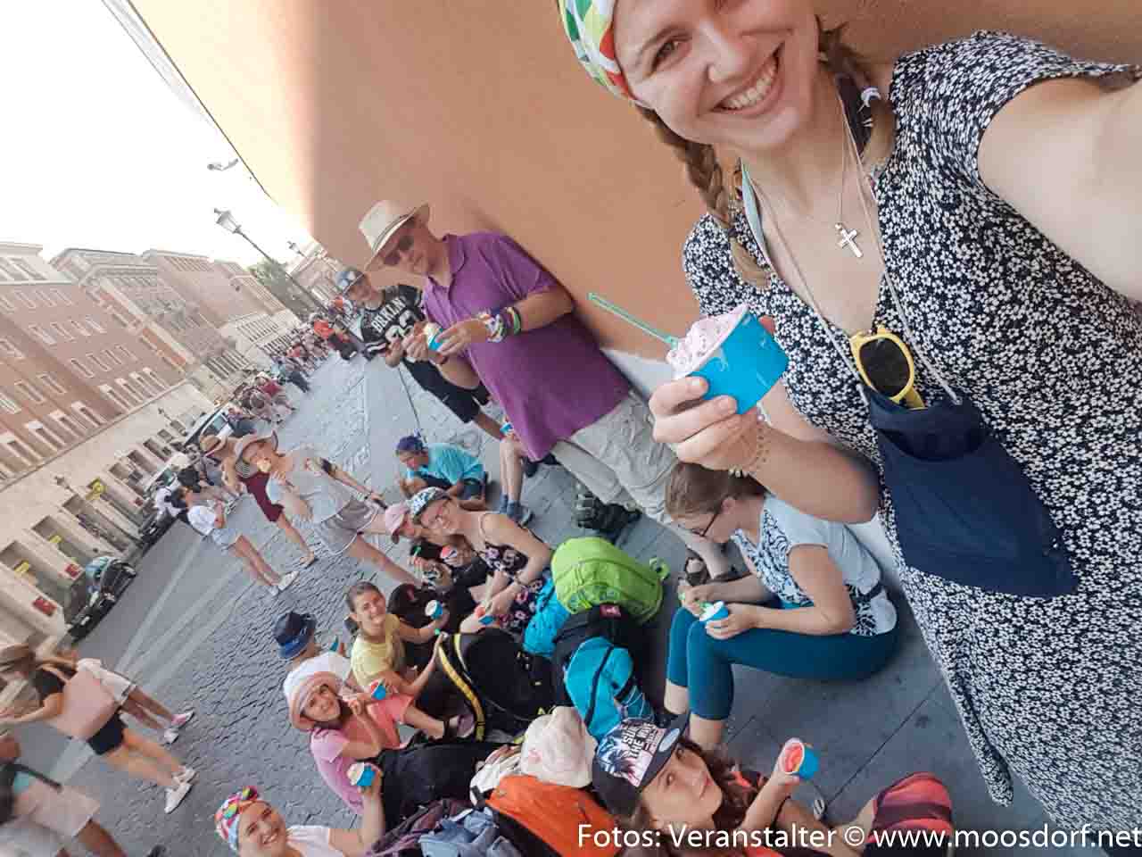 INFO: Unsere Begleiter waren Pfarrer Markus Klepsa, Laura Ries und Sandra Schmidlechner. Unsere Busgruppe bestand aus 78 Personen darunter waren 16 Begleitpersonen und 60 Kinder. Im Bus waren unter anderem Ministranten von den Gemeinden Aspach, Friedburg, Lengau, Maria Schmolln, Munderfing, Schneegattern, Tarsdorf, Vichtenstein und Waldzell. Insgesamt sind 1200 Minis aus OÖ, 3000 aus Österreich und aus ganz Europa unglaubliche 56.000. Während der Busfahrt bekamen wir unsere Pilgertücher und Buttonarmband – bei denen es üblich war, wenn man wollte, zu tauschen – und unser Pilgerheft. Wir hatten das Glück die heißbegehrten „internationalen“ Pilgertücher zu bekommen, von denen es weltweit nur 200 Stück gibt. Während wir in Rom herumgepilgert sind wurden wir immer wieder gefragt ob wir unsere Tücher oder unsere Buttons tauschen wollen.