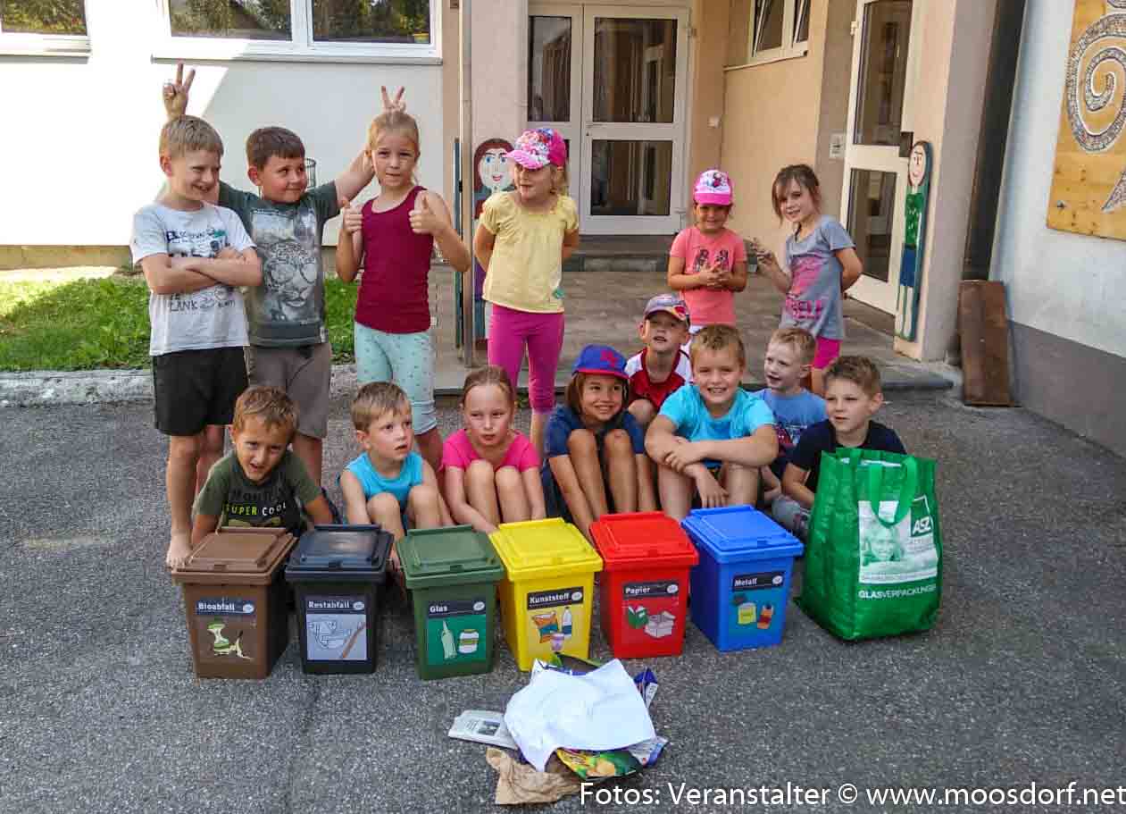 Spielerisch wurden die Kinder an Umweltschutz und Abfalltrennung herangeführt. Nach einem anfänglichen Wettlauf bei dem 2 Mannschaften die verschiedensten Abfälle richtig trennen mussten, wurden Themen rund um Abfalltrennung, -verwertung und -vermeidung besprochen. Bei der Station „Quaxi im Seerosenteich“ wurden die Kinder auf Umweltverschmutzung aufmerksam gemacht. (Quaxi ist ein trauriger Frosch, dessen Freunde aus seinem Seerosenteich ausgezogen sind, weil Menschen ihren Müll im Teich entsorgt haben. Damit die Freunde wieder Platz im Teich finden, musste dieser gesäubert werden. Für jeden entsorgten Abfall durfte ein passendes Stofftier im See einziehen.) In der Abfall-Bastelwerkstatt wurden Tetrapacks zu bunten Eulen-Vogelhäuschen umfunktioniert.