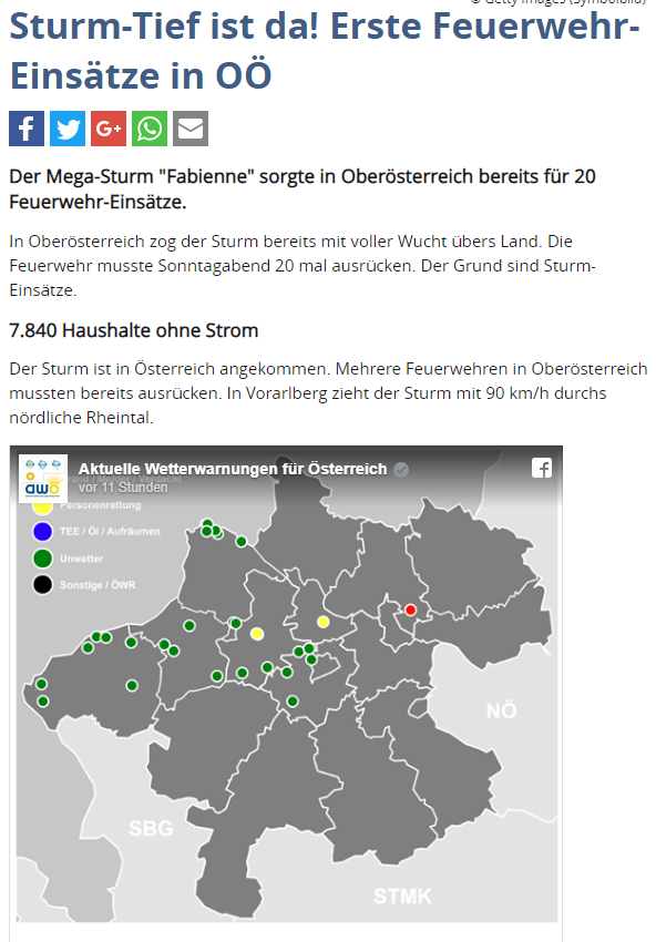 Übrigens: man sollte sich – wenn man alles zur Vorbereitung gemacht hat – auch nicht in Panik bringen lassen durch erste Wettermeldungen. Ein Beispiel aus dieser Nacht war wetter.at. Kaum liefen die ersten Alarmierungen (wie wir heute wissen für kleinere Schäden) wurde ein von einem Feuerwehr-Mann getwittertes Bild genutzt, um diese Schlagzeile zu produzieren (siehe Bild). Begriffe wie „Mega-Sturm“ und „…zog mit voller Wucht über das Land“ sind schon eher darauf ausgelegt Nutzer zum klicken zu bringen, als sinnvoll zu informieren oder zu warnen. Dabei sollte man meinen hätten die Kollegen einer speziellen Wetterseite da sicher schon selber wissen können, wie die aktuelle Lage ist und vielleicht etwas zurückhaltender sein können. Aber: das ist nur unsere Meinung.