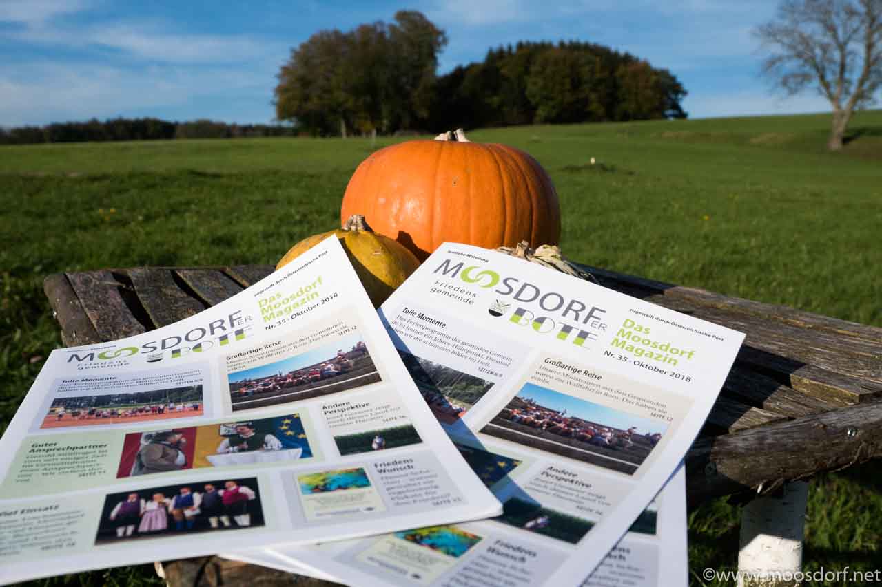 Darum wollen wir uns gerne bedanken bei allen, die auf diese Weise mithelfen. Die Texte schicken, Informationen oder Fotos. Ohne euch würde es Moosdorf weder online noch auf Papier so geben können. In diesem Sinne: weiter so! Und alle deren Geschichte in diesem Boten noch nicht drinnen ist: die kommt dann in den nächsten. Denn: der Druckunterlagenschluß ist bei der Papier-Ausgabe halt immer einige Zeit vorher. Dann kommt noch die Druckzeit und die Auslieferung dazu. Und das ist dann meist die Erklärung, warum eine Geschichte eventuell nicht mehr in den Boten gekommen ist, den ihr jetzt bald wieder in der Hand halten werdet. Das ist natürlich der Vorteil von Moosdorf.net – da können wir jederzeit un aktuell reagieren. Sicher auch ein Grund warum sich jeden Monat die Moosdorfer mehrere tausendmal hier auf diesen Seiten einloggen und nachschauen. Danke auch dafür!