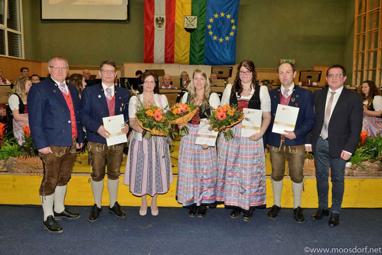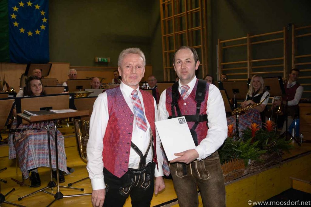 Eine Ehrenbrosche zum Dank wurde Maria Emersberger, Gattin des Obmanns, überreicht. Die Auszeichnungen für die langjährige aktive Mitgliedschaft wurden von Bürgermeister Georg Emersberger und dem Bezirkskapellmeister Josef Esterbauer übergeben.