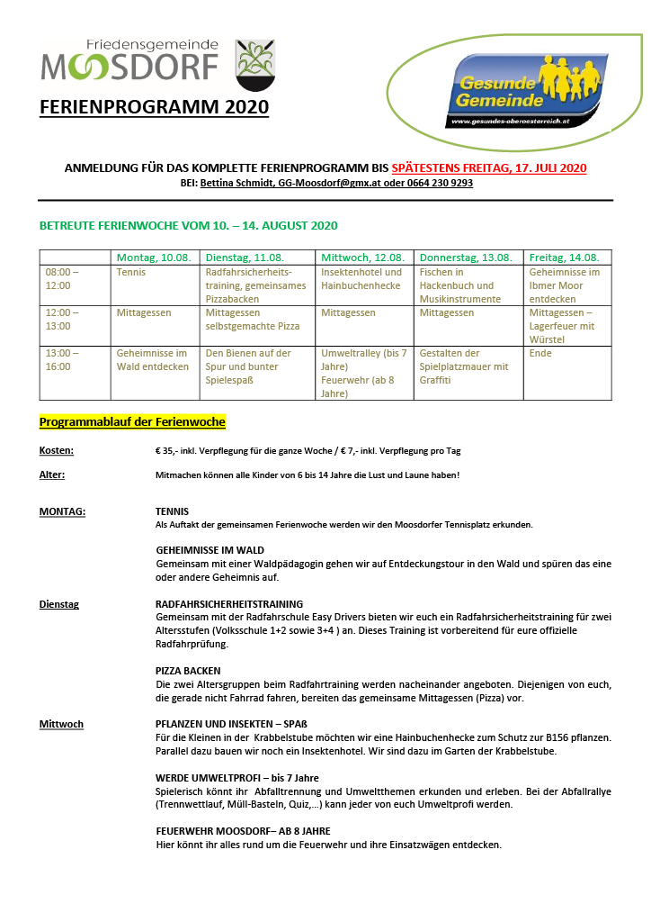 Trotz Corona will die gesunde Gemeinde auch in diesem Jahr wieder ein paar betreute Ferientage für die Moosdorfer Kinder anbieten. Das Programm ist wie immer eine tolle Mischung aus Aktion, Spaß und Wissen. Mit dabei helfen auch – neben dem engagierten Gesunde Gemeinde Team rund um Bettina Schmidt – die Vereine wieder mit.