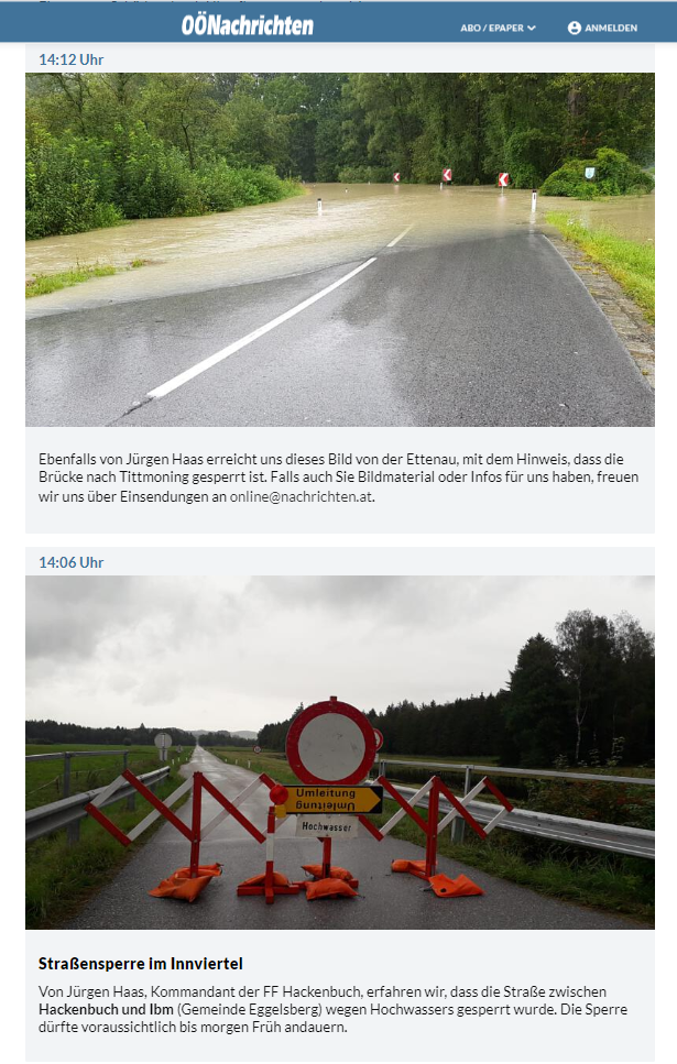 14h25 – Bilder aus Moosdorf im Liveblog der Oberösterreichischen Nachrichten: Die Nachrichten und Infos aus Moosdorf und von Jürgen fanden übrigens auch Berücksichtigung im Liveblog zum Hochwasser der Oberösterreichischen Nachrichten. Freut uns, dass wir den Kollegen helfen konnten und wir bedanken uns für die Berücksichtigung und hoffen das erspart dem einen oder anderen Leser unnötige Umwege!