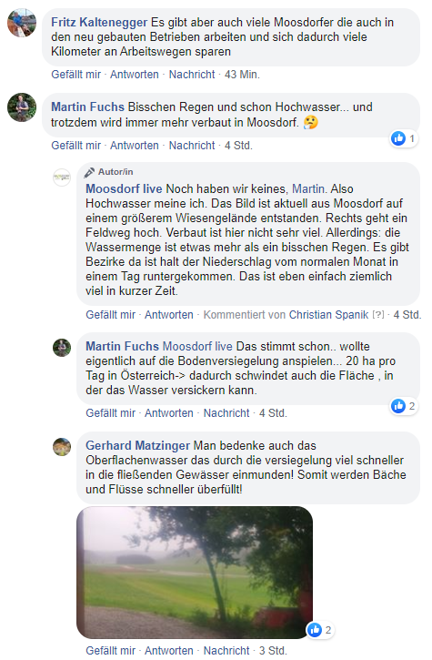 16h05 – Wasserdiskussion auf der Moosdorfer Facebook-Seite: eine im Tonfall erfreulich sachliche Diskussion hat sich im Rahmen unserer Berichterstattung zum Thema Hochwasser auf der Facebookseite ergeben. Ein Nutzer wies darauf hin, dass durch die zunehmende Versiegelung von Böden natürlich das Hochwasser-Risiko steigt. Ein weiterer ergänzte, dass dadurch auch das Wasser schneller in die Bäche fließt und weniger versickere und daher natürlich auch hier mehr Wasserdruck entsteht. Zurecht wurde aber auch argumentiert, dass das kein spezielles Moosdorfer-Problem sei. Und natürlich dass bei entsprechenden Wassermengen auch jede Region in Schwierigkeiten gerät. Ergänzt wurde auch, dass die Versiegelung die zum Beispiel durch Betriebsbau und dergleichen passiert natürlich auch wieder im positiven dafür sorgt, dass mehr Moosdorfer nicht mehr zur Arbeit auspendeln müssen. Das Thema ist übrigens auch regelmässig Thema bei Gemeinde-Versammlungen. Wer sich dazu mit dem Gemeinderat besprechen möchte ist herzlich eingeladen zu den öffentlichen Sitzungen des Gemeinderates. Hier gibt unser Bürgermeister Manfred Emersberger immer am Ende der Sitzung die Möglichkeit auch allfällige Themen anzusprechen.