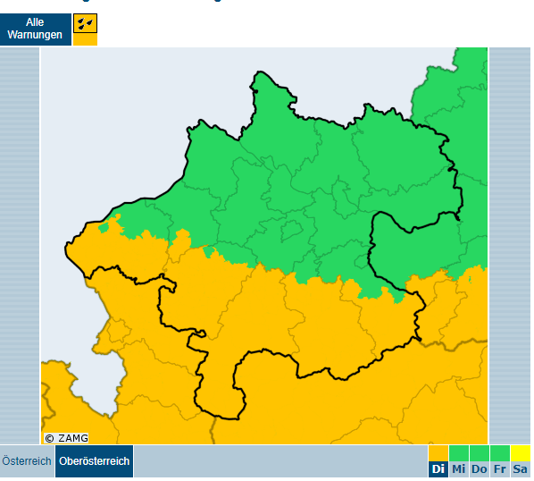 16h20: Die Regenwarnung gilt nur noch für einen Teil des Bezirks. Wie man auf der unten stehenden Karte des ZAMG erkennen kann, gilt die Regenwarung bis heute abend 18 Uhr nur noch für einen Teil des Bezirks. Moosdorf gehört da noch dazu. Allerdings ist auch bei uns der Regen jetzt deutlich schwächer geworden. Der Blick aus dem Fenster zeigt auch, dass die größeren Wasserflächen die entstanden sind bereits zurück gehen. Gehen wir also mal davon aus, dass es sich jetzt nachhaltig beruhigt. Morgen soll bereits wieder die Sonne scheinen. Wir drücken jetzt vor allem denen die Daumen, an den Flüssen (zum Beispiel in Schärding), die noch mit einem sich aufbauenden Pegelstand zu kämpfen haben und hoffen, dass dort auch alles glimpflich ausgeht.