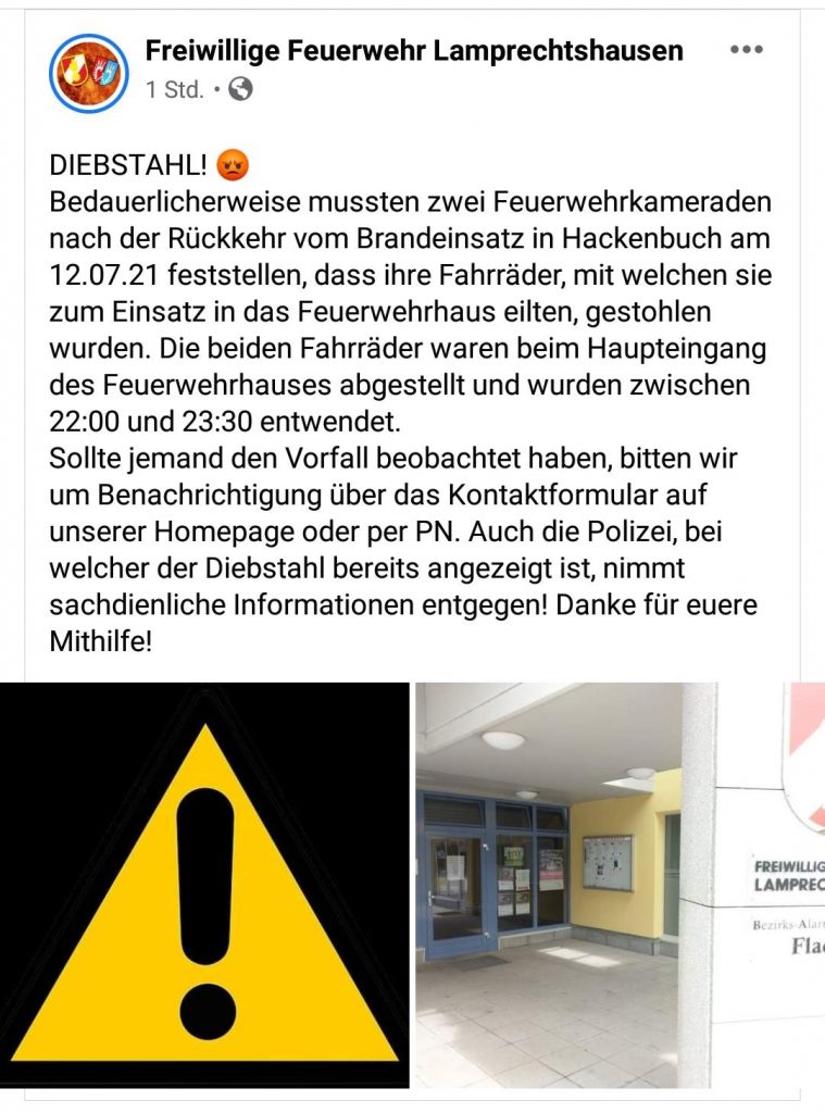 Und noch ein unerfreulicher Nachsatz: tatsächlich kamen zwei Feuerwehrkameraden aus Lamprechtshausen mit dem Rad zum Feuerwehrhaus. Von dort wurden die Räder dann entwendet! Wenn einer von euch was dazu weiß oder gar jemand das liest der warum auch immer weiß wo diese Räder sind: bitte gebt Bescheid oder stellt sie wieder bei der Feuerwehr in Lamprechtshausen ab. Denn ehrlich: das geht gar nicht. Wer zum Einsatz kommt sollte nicht durch dreisten Diebstahl bestraft werden, sondern verdient unseren Respekt.
