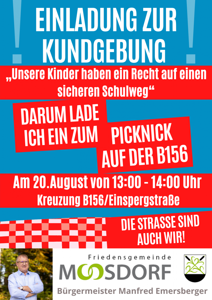 Viele Moosdorferinnen und Moosdorfer beschäftigt die B156. Das Thema Verkehrssicherheit, Lärm- und Emissionsbelastung. Und alle Fraktionen in Moosdorf setzen sich regelmäßig dafür ein, dass bestimmte Planungen und Konzepte umgesetzt werden. Aber schon seid langer Zeit, geht es nicht so recht voran. Darum will unser Bürgermeister – auch in Abstimmung mit anderen Anlieger-Gemeinden – ein Zeichen setzen. „Diesen Freitag, dem 20.8 von 13 bis 14 Uhr wollen wir der B156 ein Gesicht geben und sie sperren. Gemeinsam mit der Bevölkerung.“ Diese Demonstration für eine Lösung der Verkehrs-Thematik wurde von der BH entsprechend nun genehmigt. Alle Infos und die Stellungnahme unseres Bürgermeisters findet ihr im Text.