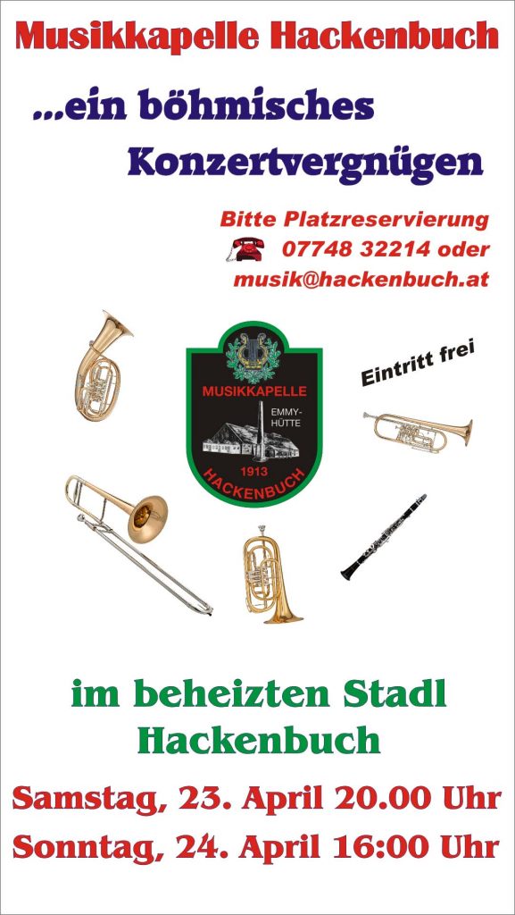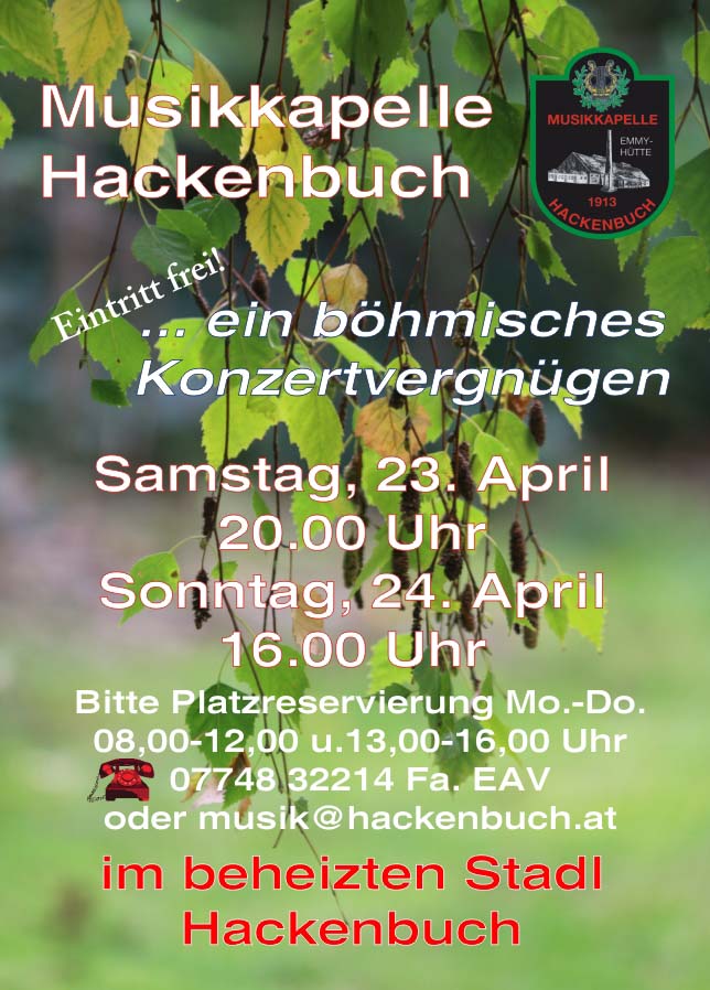 Noch ein wichtiger Hinweis in diesen Tagen: Bitte die Platzreservierung nicht übersehen. Der Eintritt ist zwar frei (natürlich sind Spenden willkommen) aber einen Platz müsst ihr bitte dennoch vorher reservieren. Das geht Montag bis Donnerstag von 8 Uhr bis 12 Uhr und von 13 Uhr bis 16 Uhr unter 07748-32214 (Das ist der Anschluss der Firma EAV). Oder per Mail unter musik@hackenbuch.at