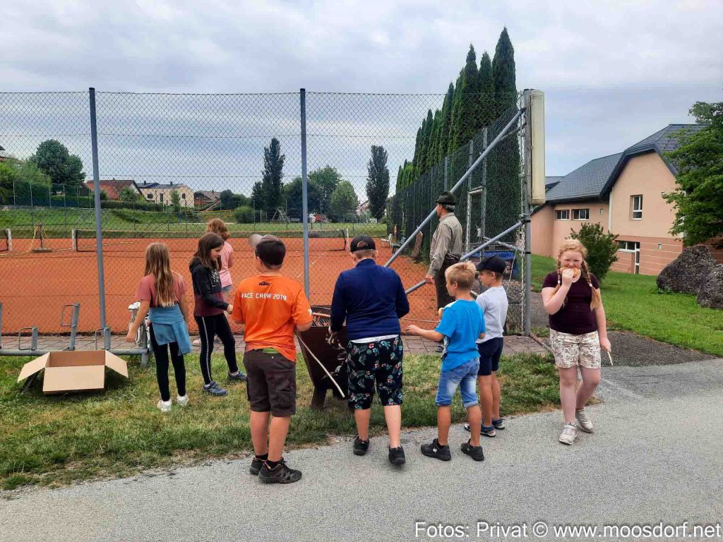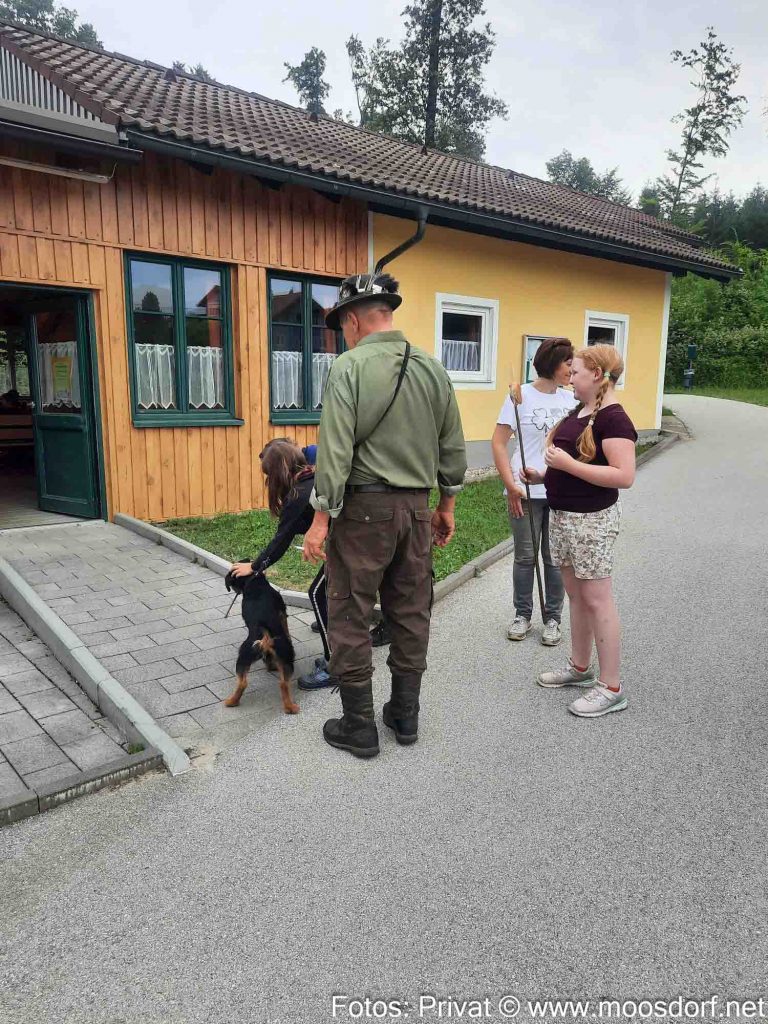 Mit hoher Motivation wurde von der Jägerschaft nicht nur eine theoretischer sondern auch ein praktischer Diskurs angeboten. Neben zahlreichen Präparaten, wo die Kinder die Möglichkeit hatten einem Fuchs ganz nahe zu kommen, wurde ihnen die Notwendigkeit der Jagd für die Natur nähergebracht. In diesem Zusammenhang wurden gesetzliche Gegebenheiten angesprochen, der vorhandene Wildbestand in Moosdorf und ganz wichtig das Verhalten im Wald und mit Wildtieren. Ein besonderer Gast war Benno, ein deutscher Jagdterrier, der den Kindern ein kleines Ständchen brachte und die Aufgabe der Jagdhunde präsentierte.