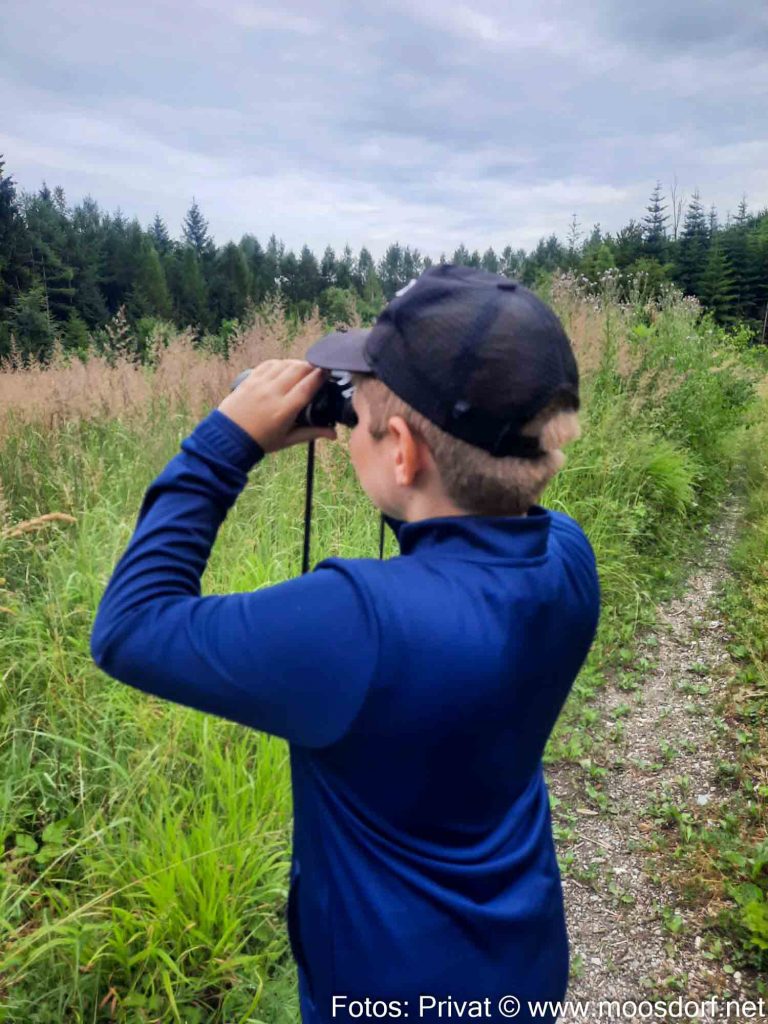 Nach diesem praktischen Teil ging es ab in das Revier Moosdorf – Mitte, um dort das erlernte Wissen anzuwenden. Hier wurden die heimischen Baumarten, Sträucher und Gräser genauer betrachtet. Die Jägerschaft ging mit den Kindern auf Spurensuche unserer Wildtiere und wurden rasch fündig. Danach ging es auf zu den Reviereinrichtungen, wo eine Fasanenschütte sowie ein Hochstand von den Kindern genau inspiziert wurden.