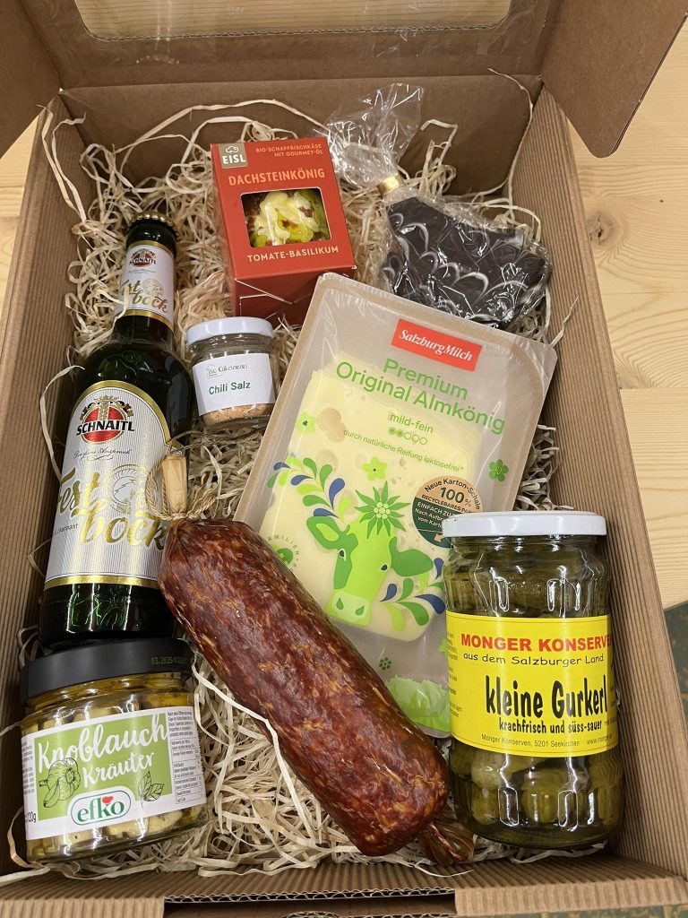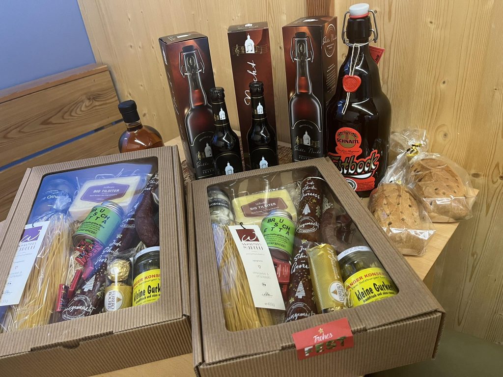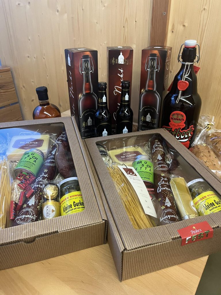 Als Weihnachtsaktion gibt es: Weihnachtsschinken BIO, Festagssalami BIO, Leberkäsbrät, Mettwürste Kletzenbrot und natürlich auch Kekse. Dass es Festbock und Stille Nacht Bier gibt, ist ja eh klar 😉 Und außerdem Kramer z ‚Moosdorf -Geschenkboxen im Wert von 25-100€ – ganz nach Gusto. Ein paar seht ihr auf unserer Bildcollage.