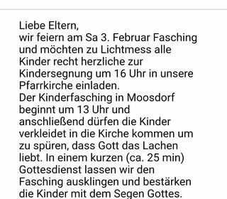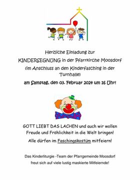 Der Kinderfasching in der Turnhalle in Moosdorf findet am 03.02. ab 13 Uhr statt. Zusätzlich gibt es an dem Tag einen speziellen kurzen Event ab 16 Uhr in der Pfarrkirche in Moosdorf. Dazu schreibt die Pfarre: