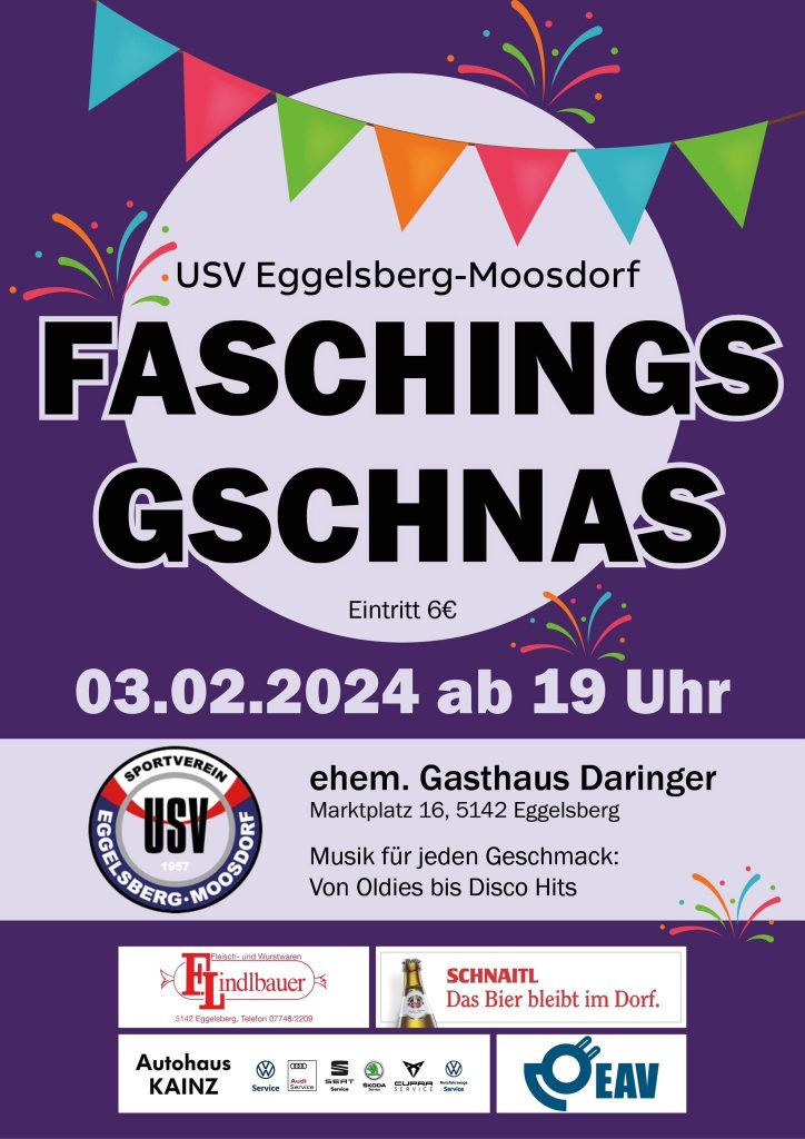 Für Erwachsene gibt es das Faschings-Gschnas vom USV Eggelsberg / Moosdorf. Das ganze findet am 03.02. ab 19 Uhr statt. Und zwar in Eggelsberg. Der USV schreibt dazu auf seiner Facebookseite:
