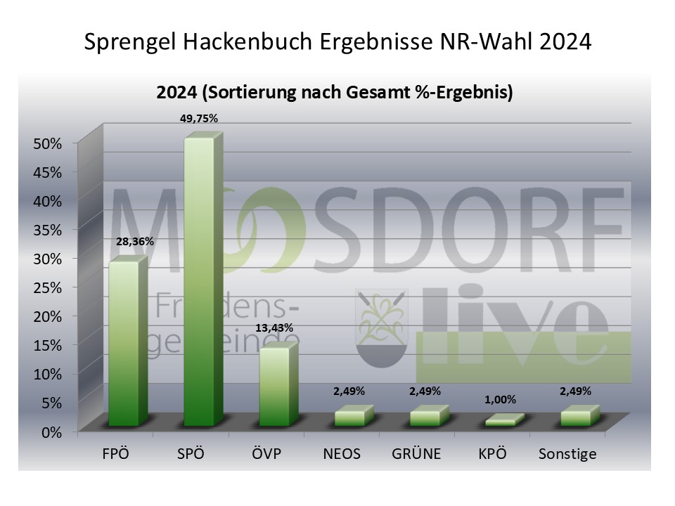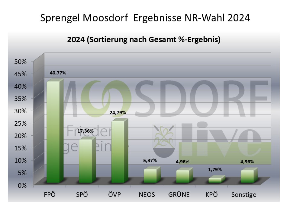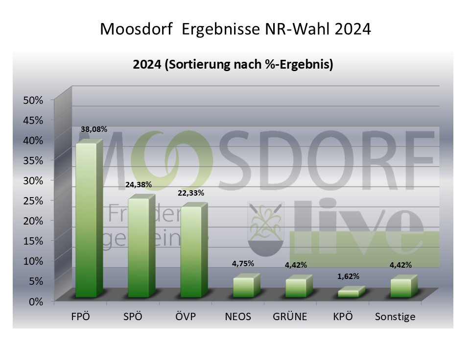 Am meisten Stimmzuwachs verzeichnete die FPÖ mit fast 15%, die SPÖ hatte in Stimmen zwar ebenfalls einen Zuwachs, verlor aber auf Basis der Wahlbeteiligung dennoch knapp in Prozenten etwas unter 1%. Die ÖVP hat etwas weniger als 16% an Stimmen verloren. Die Grünen verloren etwas mehr als 3% und die NEOS gewannen etwas über 1%. Die KPÖ hatte ebenfalls leichte Zugewinne unter 0,5% in Moosdorf.